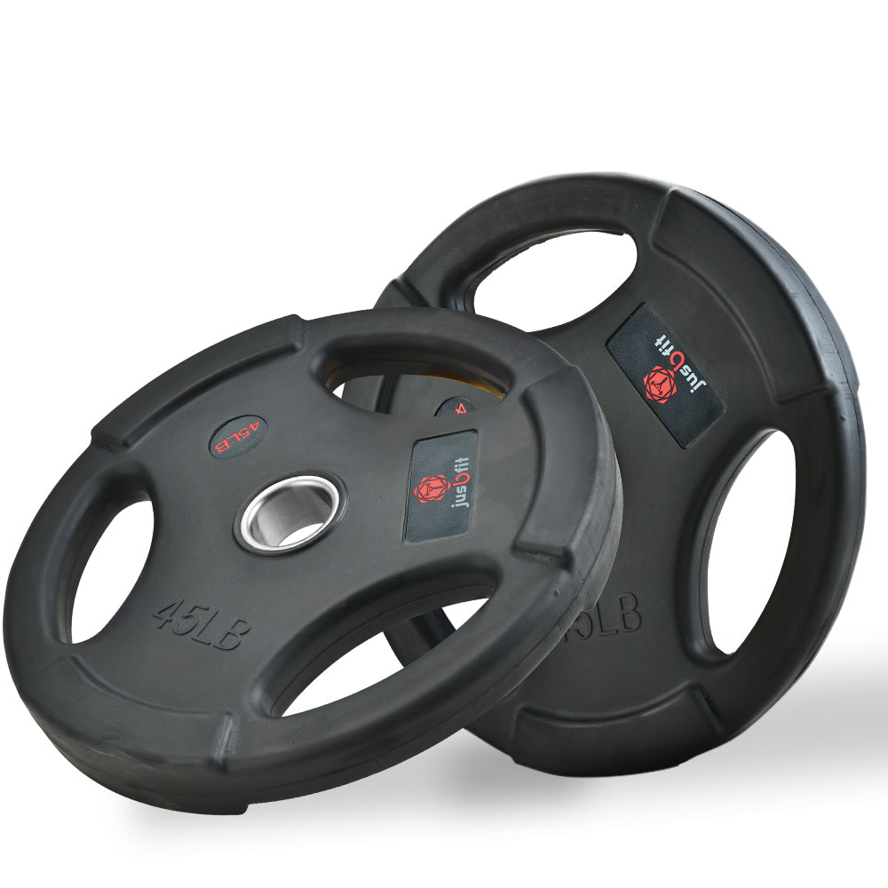 The JusBfit Series launched by Proflex is true commercial-grade gear that makes it ideal for anyone looking for gear that will stand the test of time. The range of Tri-Grip Olympic Weight Plates are heavy-duty in structural integrity with one-piece forged construction and ergonomically engineered for comfortable and safe handling.They feature ultra-rugged, split, crack and peel resistant rubber casings to protect your floors and other equipment.