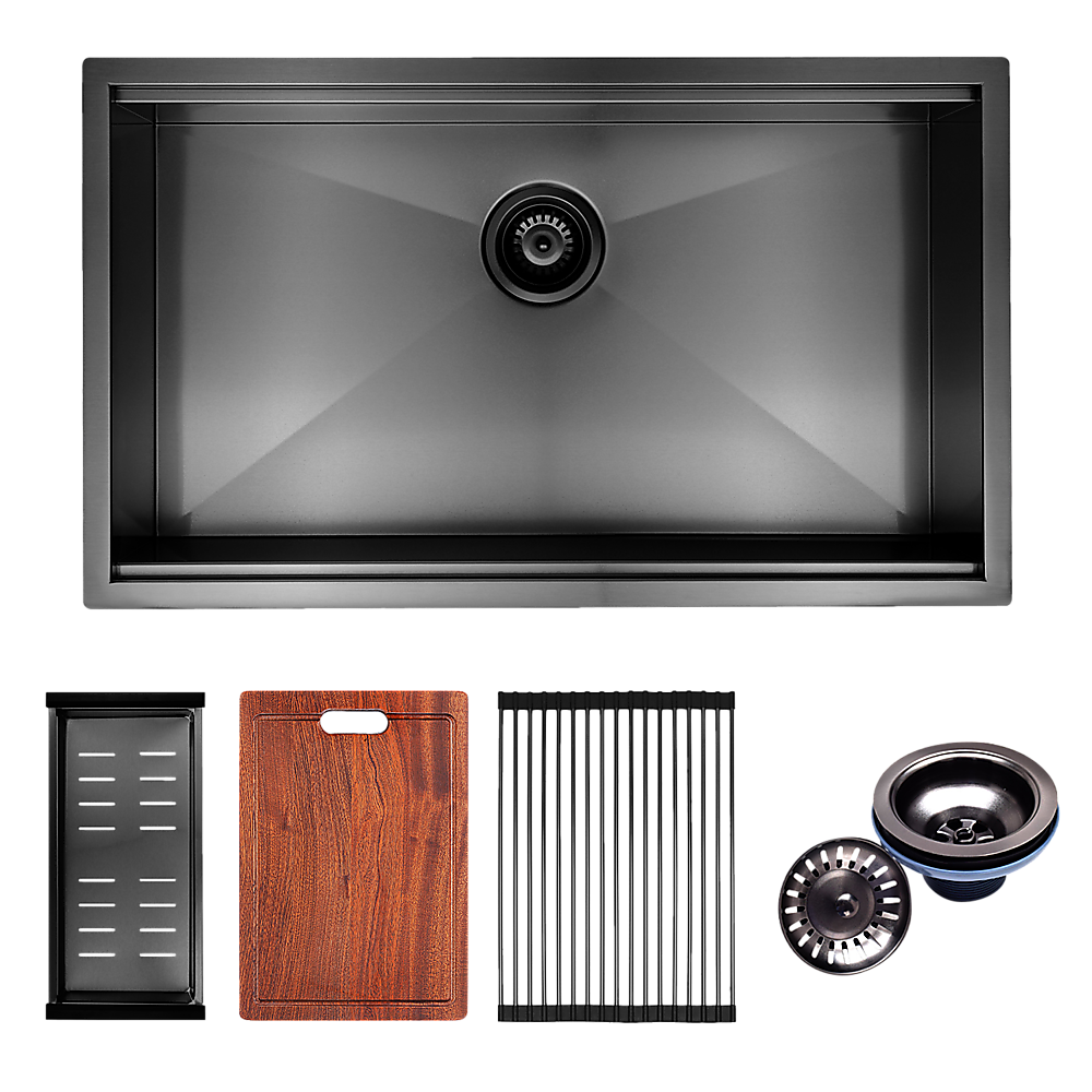 This WORKSTATION sink from BRIENZ maximizes the functionality of your kitchen sink by adding built-in accessories that slide on integrated ledges built into the sink. Includes a deep STAINLESS STEEL COLANDER that you can also use as a caddy for your dish soap and sponge. The solid CUTTING BOARD is constructed of luxurious hardwood that has a