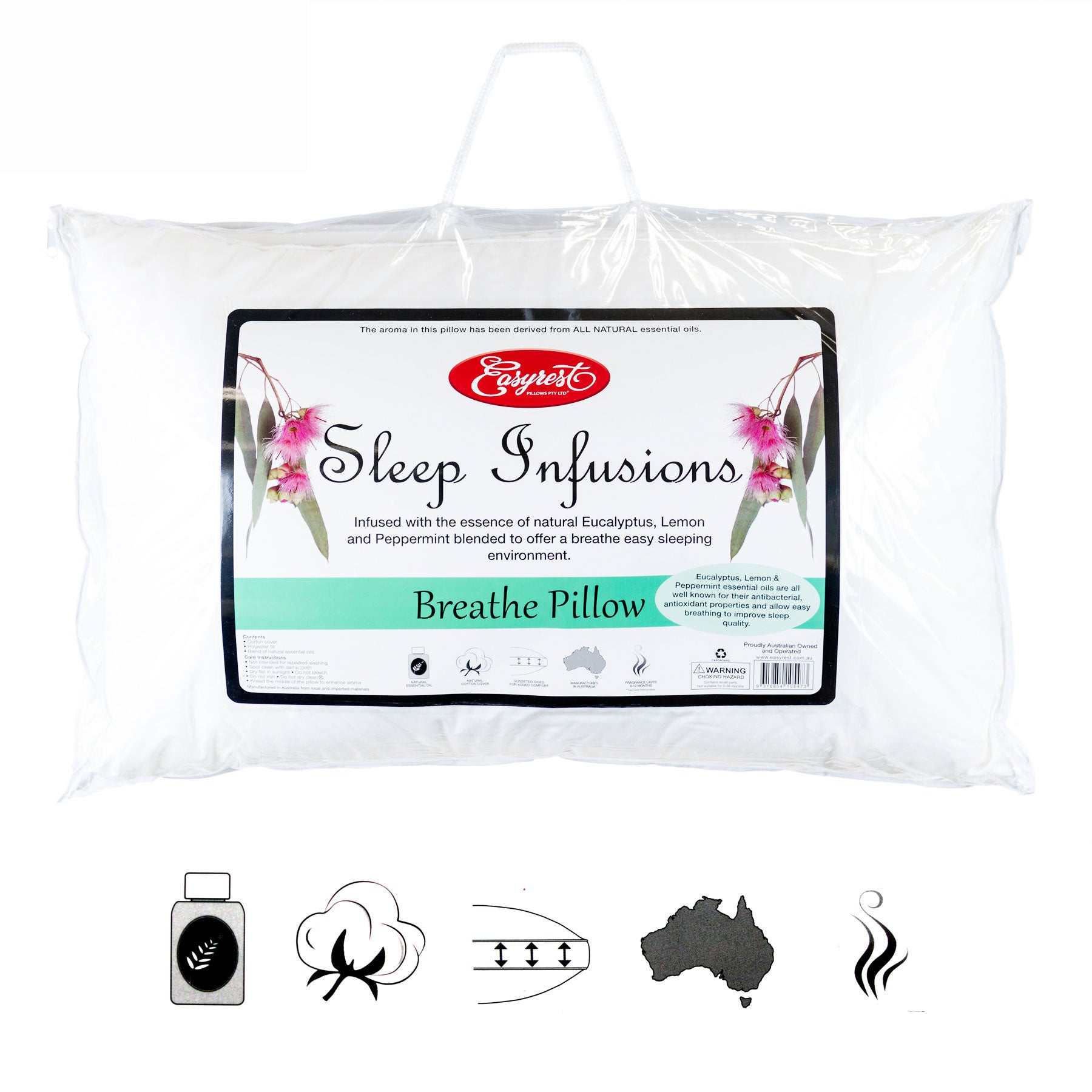 The aroma in this Sleep Infusions Eucalyptus Lemon and Pepermint Breathe Pillow 45 x 70 cm by Easyrest has been derived from ALL NATURAL essential oils. Infused with the essence of natural Eucalyptus, Lemon and Peppermint blended to offer a breathe easy sleeping environment. Eucalyptus, Lemon & Peppermint essential oils are all well known for their antibacterial, antioxidant properties and allow easy breathing to improve sleep quality. Fragrance lasts 6 - 12 months. Features solid colour tone design and made from soft 100% Cotton fabric.