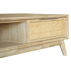 A beautiful centre table that enhances the loveliness of a living room with its distinctive structure. It has 2 drawers with full extension metal runners. The drawers are accessible from both sides of the table and the table also has a niche which is open from both sides. The coffee table, which is beautifully designed in the tropical style, will add a new dimension to your living space. The table has attractive tapered legs, and its drawers have beautiful silver metal handles. It is a unique furniture piece in a brushed smoke colour. Adding to its strength and charm, the coffee table is made of sustainably harvested Solid Acacia timber paired with a rattan accent, with rich grain and beautiful knots. The coffee table's drawers have beautiful Rattan work, giving them an ethnic look. The fully assembled coffee table comes with a one-year warranty.