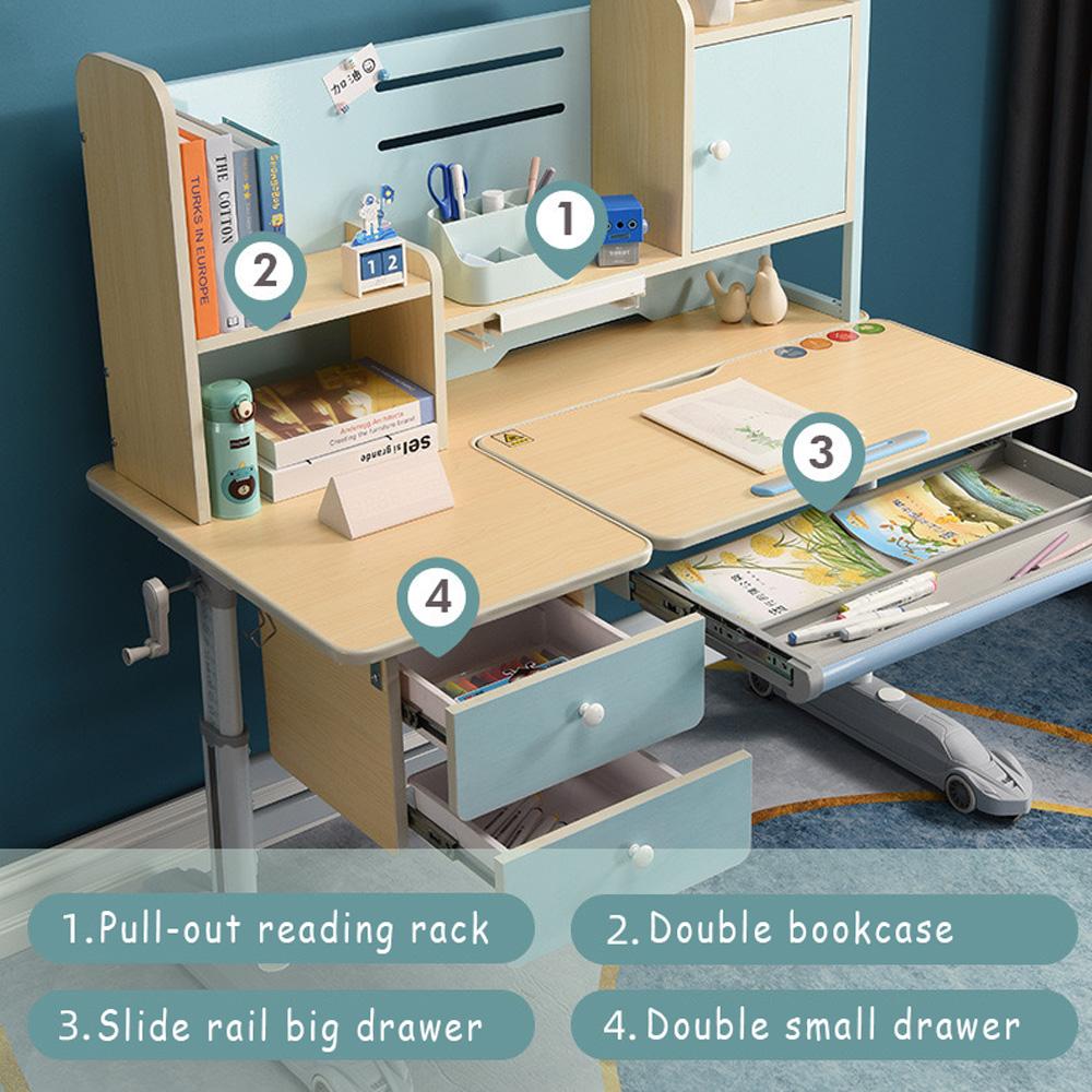 This Ergonomic Multi-Function kid's desk can be your child's ideal learning partner! This Kids writing table is made of solid rubber wood, with wood grain surface, height is adjustable from 55-75 cm for the desktop with locking rotary knobs to grow with your child. And the desktop can be tilted from 0-65°angle to protect their eyesight and being Drafting Table. Kids can store their various stationery on the extra bookshelf or in the embedded pull-out drawer. The rotatable rack offers a proper distance and angle for reading books.