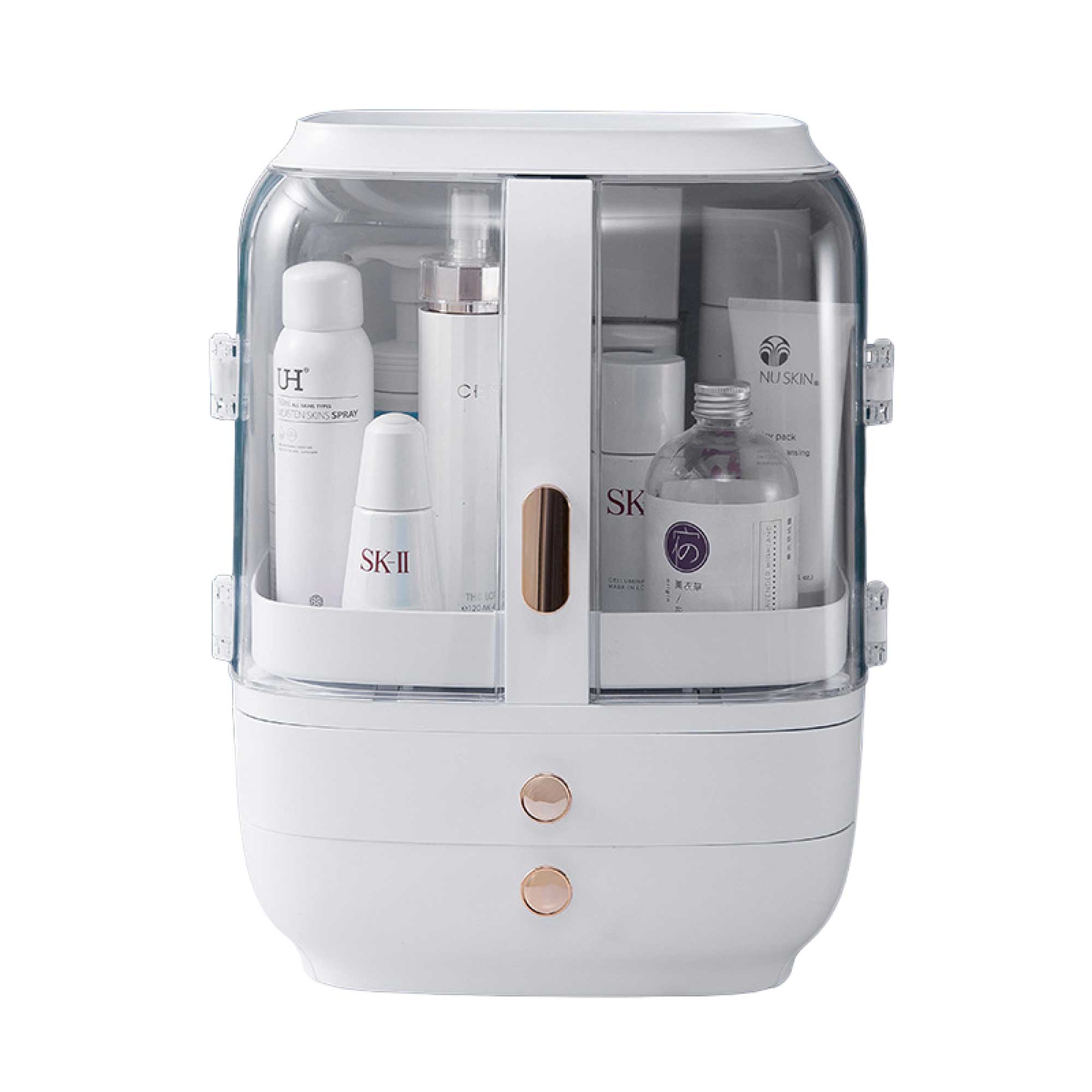No assembly required, the countertop organiser has a transparent front, which not only protects your skincare products from accumulating dust, it also safeguards them from water.